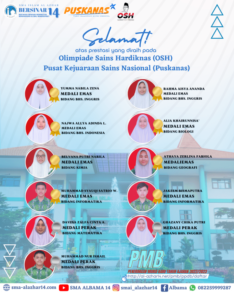 Alhamdulillah, kali ini prestasi diukir oleh murid-murid SMA Islam Al Azhar 14 Semarang yang meraih berbagai medali pada Olimpiade Sains Hardiknas (OSH) diselenggarakan oleh Pusat Kejuaraan Sains Nasional (Puskanas) 2022.