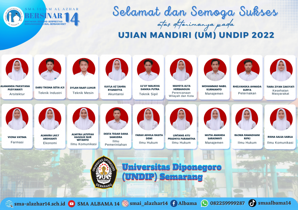 Alhamdulillah, prestasi luar biasa 18 murid SMA Islam Al Azhar 14 Semarang kembali dinyatakan lolos Universitas Diponegoro (UNDIP) melalui jalur Ujian Mandiri, diantaranya: