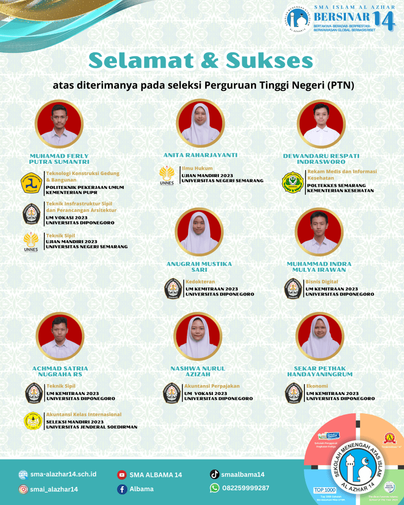 Alhamdulillah murid SMA Al Azhar 14 Angkatan 6 yang diterima Perguruan Tinggi Negeri terus bertambah, kali ini melalui jalur seleksi mandiri Politeknik PU, UNDIP, UNNES, UNSOED, POLTEKKES Semarang.