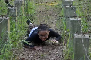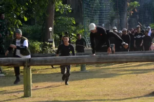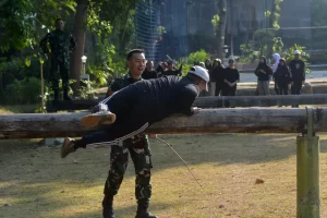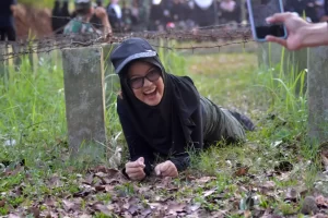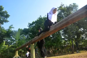Siswa SMA Islam Al Azhar 14 Semarang mengikuti kegiatan outbond berupa halang rintang dan rintangan kawat berduri di kompleks Mako Batalyon Arhanud 15/DBY, Semarang, Jawa Tengah, Kamis (24/8/2023) sore. Outbond salah satu rangkaian kegiatan Character Building dan Perkemahan Pramuka yang diikuti sebanyak 162 siswa kelas X selama tiga hari, Rabu-Jumat (23-25/8/2023) di Yon Arhanud 15/DBY.