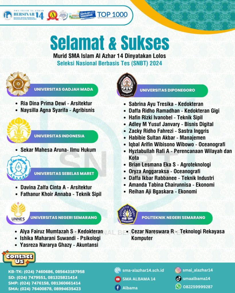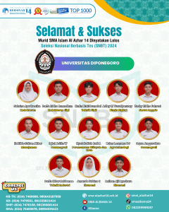 Alhamdulillah, tahun ini, jumlah murid SMA Islam Al Azhar 14 yang diterima melalui jalur SNBT meningkat (dari 19 menjadi 22 anak). Di samping itu, ada tiga anak yang diterima di jurusan kedokteran (2 UNDIP dan 1 UNNES). UNDIP masih menjadi favorit, tetapi juga ada yang diterima di UI, UGM, dan PTN favorit lainnya. Alhamdulillah. Semoga bisa menginspirasi adik-adik angkatannya.. Aamiin.