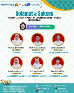 Alhamdulillah, sebanyak 15 murid SMA Islam Al Azhar 14 berhasil lolos seleksi jurusan kedokteran di berbagai perguruan tinggi baik negeri maupun swasta di Indonesia. Beberapa perguruan tinggi tersebut di antaranya UNHAN, UNDIP, UNHAS, UNNES, UNAIR, UB, UNISSULA, UNIMUS, dll. Para murid lulus melalui berbagai jalur seleksi di antaranya SNBP, SNBT, dan UM, jalur prestasi rapor, CBT, dll.