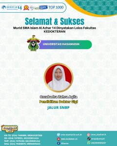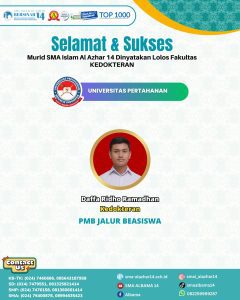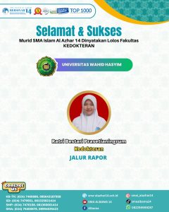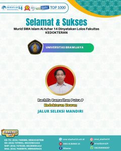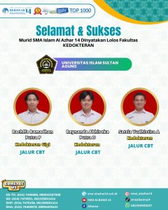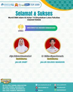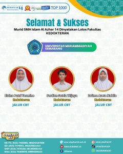 Alhamdulillah, sebanyak 15 murid SMA Islam Al Azhar 14 berhasil lolos seleksi jurusan kedokteran di berbagai perguruan tinggi baik negeri maupun swasta di Indonesia. Beberapa perguruan tinggi tersebut di antaranya UNHAN, UNDIP, UNHAS, UNNES, UNAIR, UB, UNISSULA, UNIMUS, dll. Para murid lulus melalui berbagai jalur seleksi di antaranya SNBP, SNBT, dan UM, jalur prestasi rapor, CBT, dll.