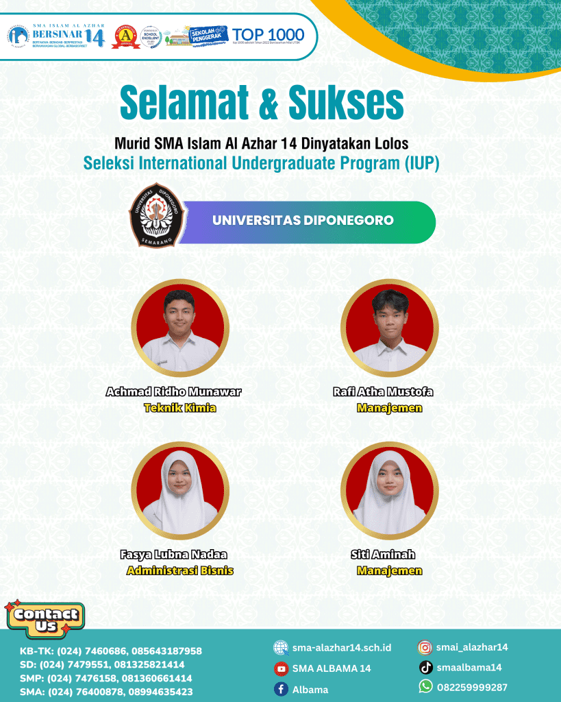 Alhamdulillah, murid SMA Islam Al Azhar 14 dinyatakan lolos seleksi Perguruan Tinggi Negeri melalui jalur International Undergraduate Program (IUP) UNDIP