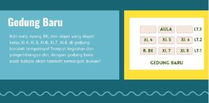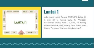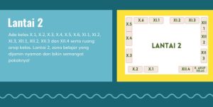 Murid-murid akan masuk area sekolah melewati lobi. Pada lantai pertama, murid akan menemukan Aula lantai 1, kemudian dapur, dilanjutkan dengan ruang wakil kepala sekolah. Setelah itu akan menemukan pojok baca lantai 1, dan ruang guru. Selanjutnya, akan menemukan ruang kelas XII 5, DAN XII 6, serta  ruang rapat, ruang OSIS/MPK. Lantai 1 juga terdapat ruang kepala sekolah,  tata usaha,  UKS. Seluruh ruangan dirancang agar efisien dan mendukung aktivitas operasional sekolah secara optimal.