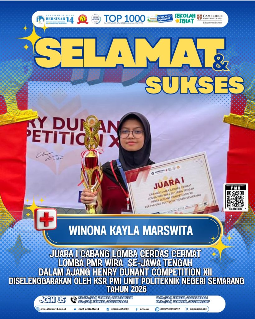 Prestasi membanggakan kembali diraih oleh siswa SMA Islam Al Azhar 14 Semarang. Winona Kayla Marswita berhasil meraih Juara I Cabang Lomba Cerdas Cermat PMR Wira se-Jawa Tengah dalam ajang Henry Dunant Competition XII yang diselenggarakan oleh KSR PMI Unit Politeknik Negeri Semarang pada tahun 2026. Keberhasilan ini menunjukkan kemampuan luar biasa dalam penguasaan pengetahuan kepalangmerahan, …