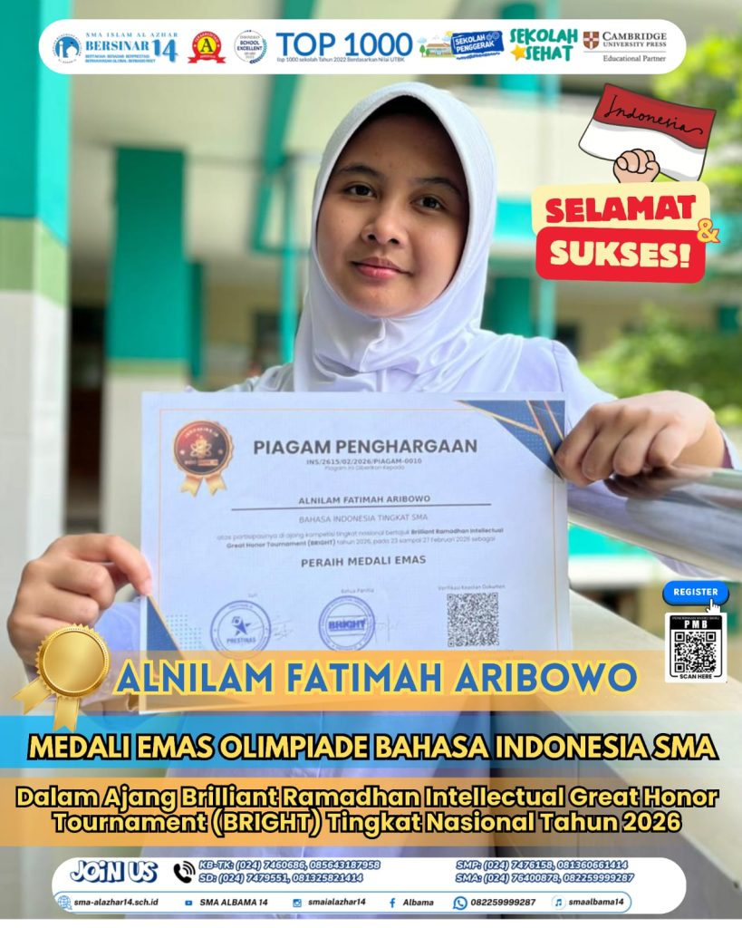 Prestasi membanggakan kembali ditorehkan oleh siswi SMA Islam Al Azhar 14, Alnilam Fatimah Aribowo, yang berhasil meraih Medali Emas Olimpiade Bahasa Indonesia tingkat SMA dalam ajang Brilliant Ramadhan Intellectual Great Honor Tournament (BRIGHT) 2026 tingkat nasional. Pencapaian ini membuktikan bahwa kecintaan pada bahasa, ketekunan belajar, dan keberanian berkompetisi mampu membawa siswa melangkah hingga podium juara. …