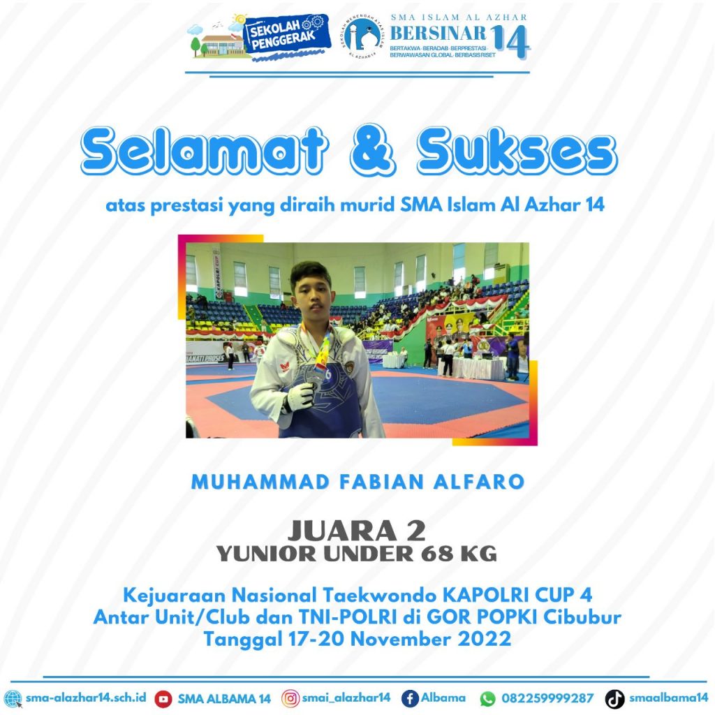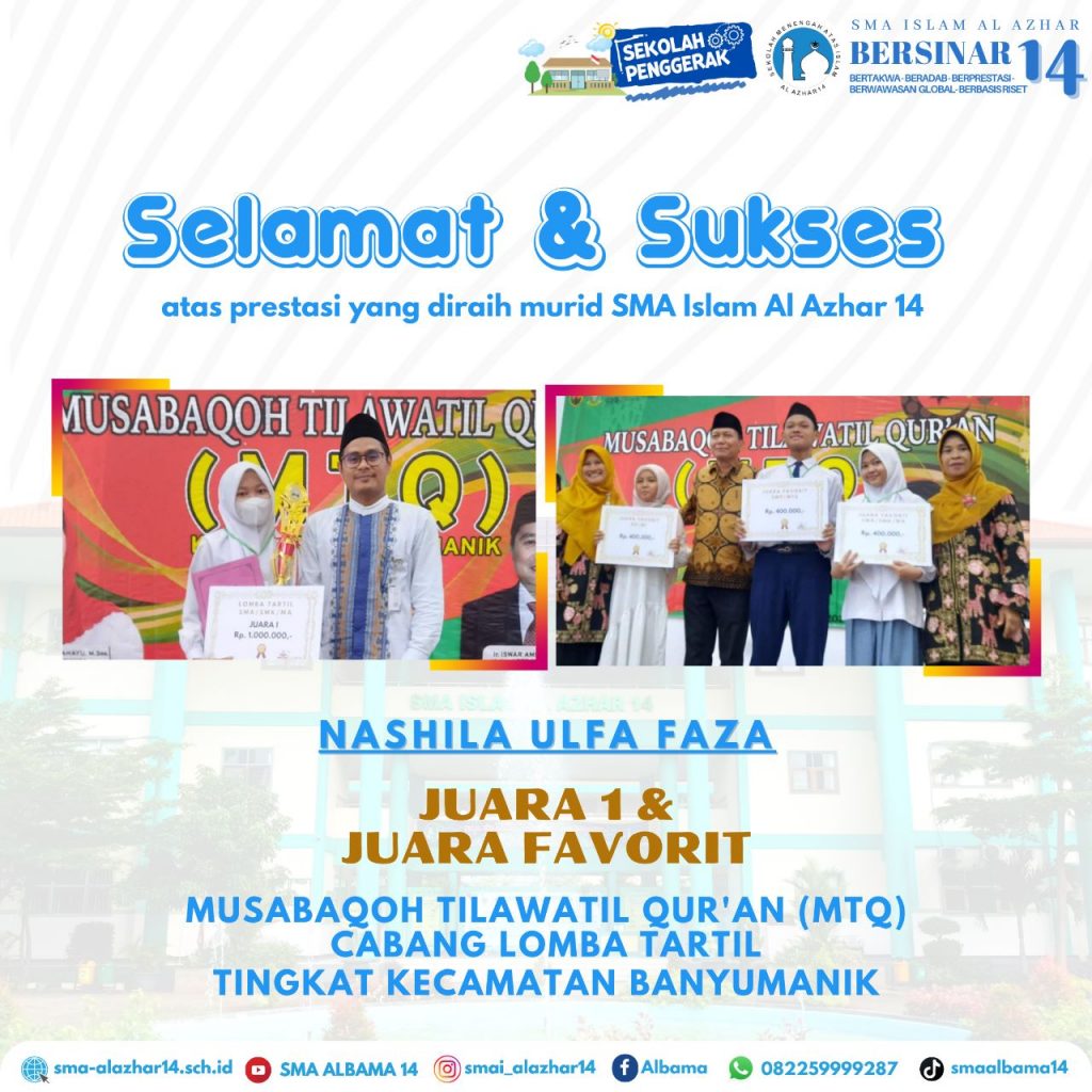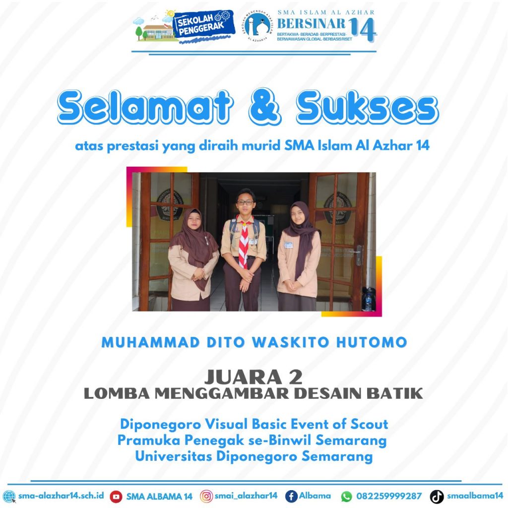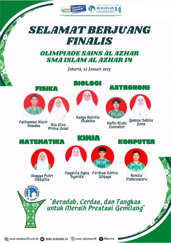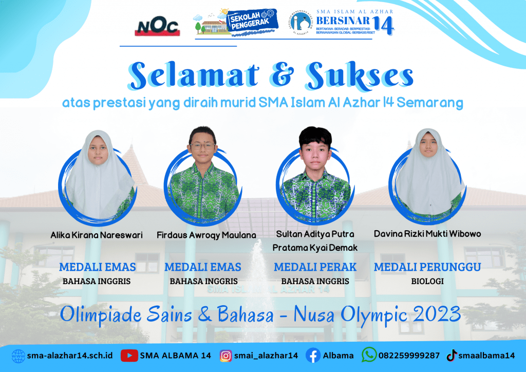 Bismillah.. #KabarPrestasiAlbama SMA ISLAM AL AZHAR 14 BERSINAR Alhamdulillah prestasi diukir oleh murid-murid SMA Islam Al Azhar 14 dalam Olimpiade Sains dan Bahasa 2023 yang diselenggarakan oleh Nusa Olympic, diantaranya: 1. Alika Kirana Nareswari_Bahasa Inggris_Medali Emas 2. Firdaus Awroqy Maulana_Bahasa Inggris_Medali Emas 3. Sultan Aditya Putra Pratama Kyai Demak_Bahasa Inggris_Medali Perak 4. Davina Rizki Mukti …