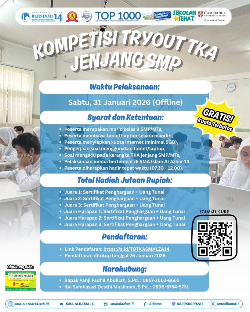 Kapan Lagi Try Out TKA SMP Gratis dan Berhadiah? Ayo Ikut Kompetisi di SMA Islam Al Azhar 14 Semarang, Cek Syaratnya! SMALZA 14-Menjelang pelaksanaan Tes Kompetensi Akademik (TKA) jenjang SMP Tahun 2026, kesiapan akademik siswa kelas IX menjadi hal yang sangat krusial. Berdasarkan linimasa resmi, TKA SMP diawali dengan simulasi pada 23 Februariโ1 Maret 2026, …