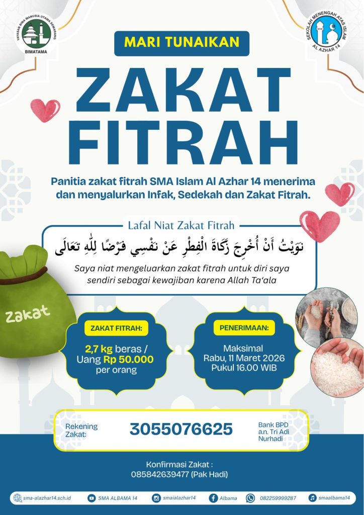 🌙 Saatnya Sempurnakan Ibadah dengan Zakat🌙 Assalamu’alaikum Warahmatullahi Wabarakatuh Allah SWT berfirman dalam QS. Al-Baqarah ayat 43: Dan dirikanlah sholat, tunaikanlah zakat, dan ruku’lah bersama orang-orang yang ruku’ Dalam rangka menyempurnakan ibadah dan berbagi kebahagiaan, Panitia Zakat SMA Islam Al Azhar 14 Semarang menerima serta menyalurkan: ✨ Zakat Fitrah ✨ Zakat Mal ✨ Infaq ✨ …