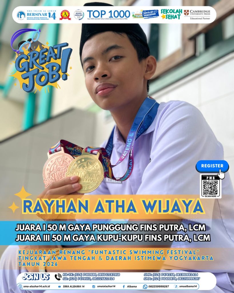 Prestasi lahir dari disiplin, ketekunan, dan lingkungan yang mendukung potensi siswa untuk berkembang. Kabar membanggakan datang dari siswa SMA Islam Al Azhar 14 Semarang, Rayhan Atha Wijaya, yang berhasil meraih Juara I 50 Meter Gaya Punggung Fins Putra dan Juara III 50 Meter Gaya Kupu-Kupu Fins Putra dalam ajang Funtastic Swimming Festival tingkat Jawa Tengah …