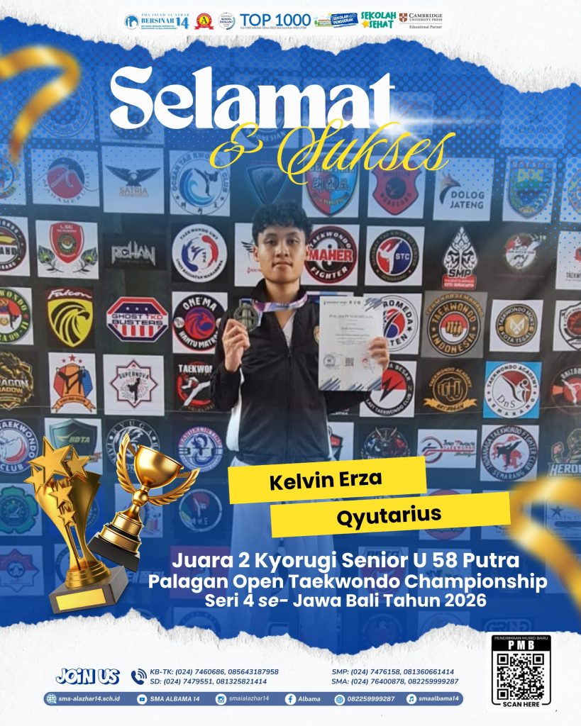 restasi kembali ditorehkan oleh siswa SMA Islam Al Azhar 14 Semarang. Kelvin Erza Qyutarius berhasil meraih Juara 2 Kyorugi Senior U-58 Putra dalam ajang Palagan Open Taekwondo Championship Seri 4 se-Jawa Bali Tahun 2026. Kompetisi ini diikuti oleh atlet-atlet terbaik dari berbagai daerah, sehingga pencapaian tersebut menjadi bukti nyata dari kerja keras, disiplin latihan, serta …