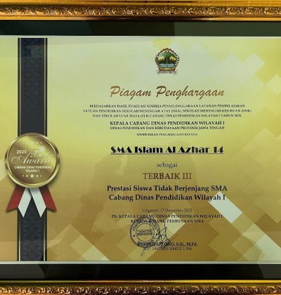 Prestasi Siap Usap Layar Berkali-kali! Inilah Deretan Prestasi Murid SMA Islam Al Azhar 14 Semarang 2025 Selengkapnya Mohon Doa dan Restu, Kontingen SMALZA 14 Siap Berjuang dalam Ajang Olimpiade Sains Al Azhar (OSA) XVIII Tahun 2026 Selengkapnya Dorong Budaya Riset dan Inovasi, SMA Islam Al Azhar 14 Semarang Gelar Workshop dengan Muara Festival Riset 2026 Selengkapnya Cabang Dinas Pendidikan Wilayah 1 Anugerahkan Peringkat Terbaik III Prestasi Siswa kepada SMALZA 14 Tahun 2025 Selengkapnya Alhamdullilah! Murid SMALZA 14 Raih Nilai 100 TKA Biologi, Disusul Hasil Cemerlang di Mapel Lainnya! Selengkapnya Tujuh Daftar Sekolah Swasta Terbaik di Semarang Berdasarkan SNBP dan SNBT 2025! Sekolahmu Peringkat Berapa? Selengkapnya HaKI Berhasil Mencatat Karya Ciptaan Murid dan Guru Smalza 14 Selengkapnya Berita Terkini! 80% Lulusan SMA Islam Al Azhar 14 Lolos PTN, PTLN, dan Sekolah Kedinasan Selengkapnya Mohon Doa dan Restu Abrar dan Degita Siap Melaju OMI Provinsi 2025! Selengkapnya Taekwondo Antar Kelvin ke Podium Juara II Selengkapnya Anindya Rarasati Mengikuti Pertukaran Pelajar Selama Satu Semester di Plymouth University Selengkapnya Mohon Doa dan Restu: Lima Murid SMALZA 14 Siap Melaju OSN Tingkat Provinsi! Selengkapnya Posts navigation 1 2 3 4 … 14